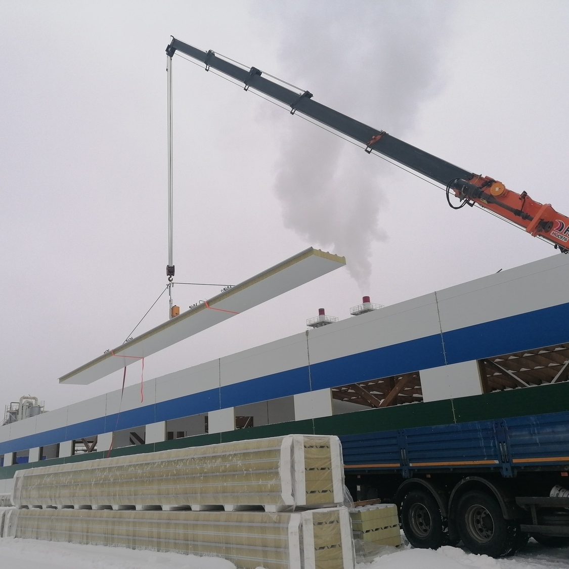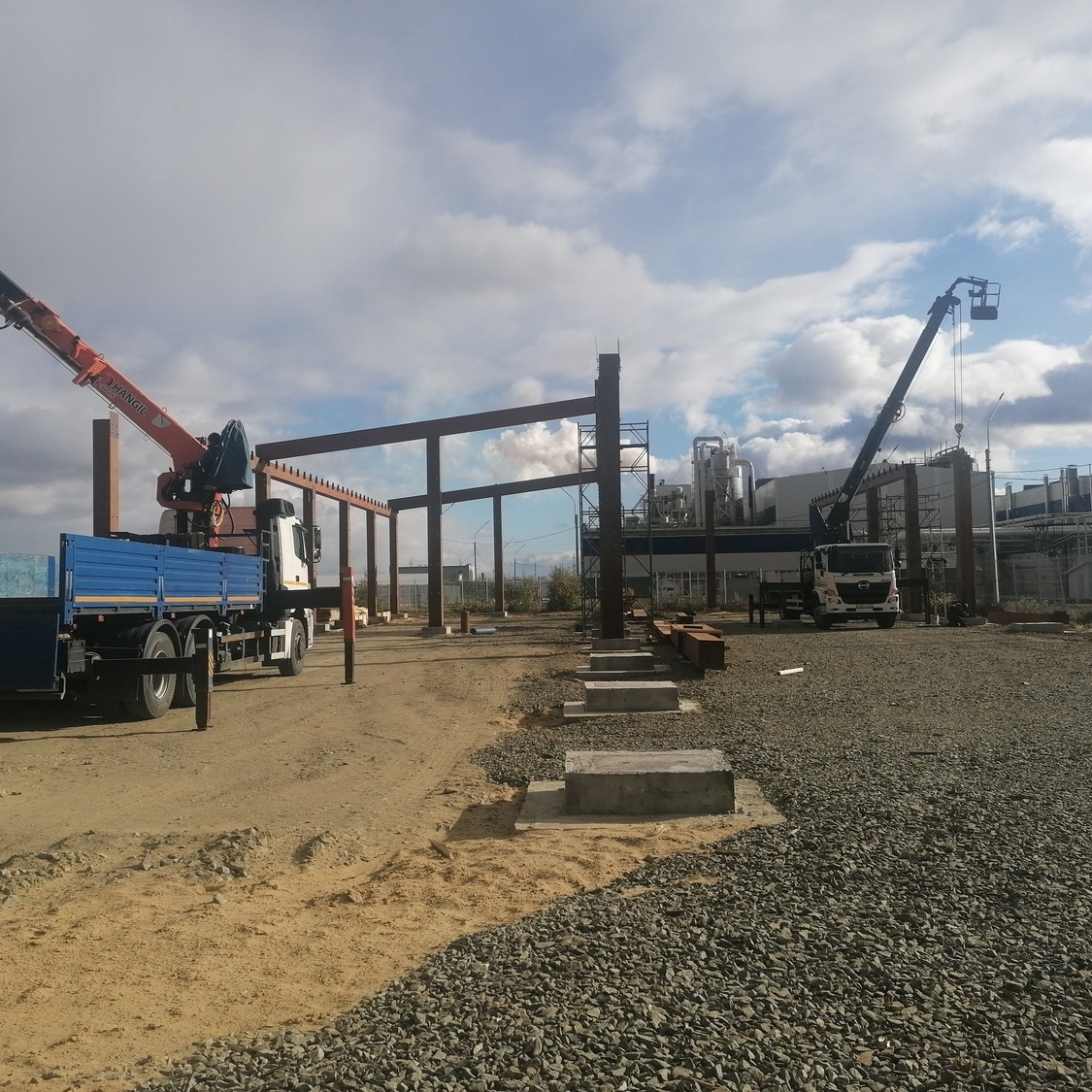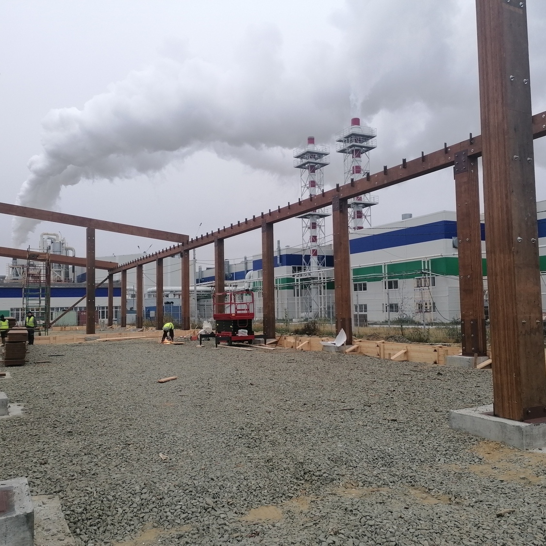 Монтаж навеса с несущими конструкциями из ЛВЛ-бруса на участке погрузки готовой продукции завода «Югра-Плит» АО «Югорский лесопромышленный холдинг».